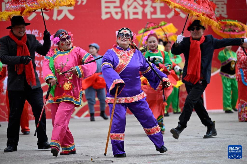 2月20日,在宁夏银川市,参赛社火队的演员表演传统社火项目。