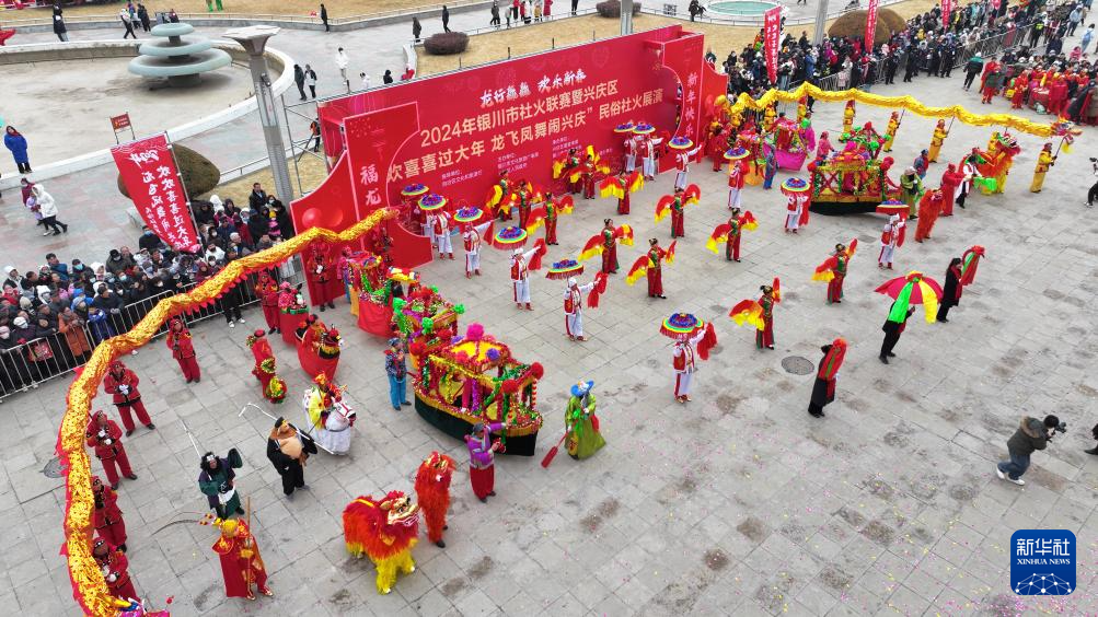 2月20日,在宁夏银川市,参赛社火队的演员为市民表演传统社火项目(无人机照片)。