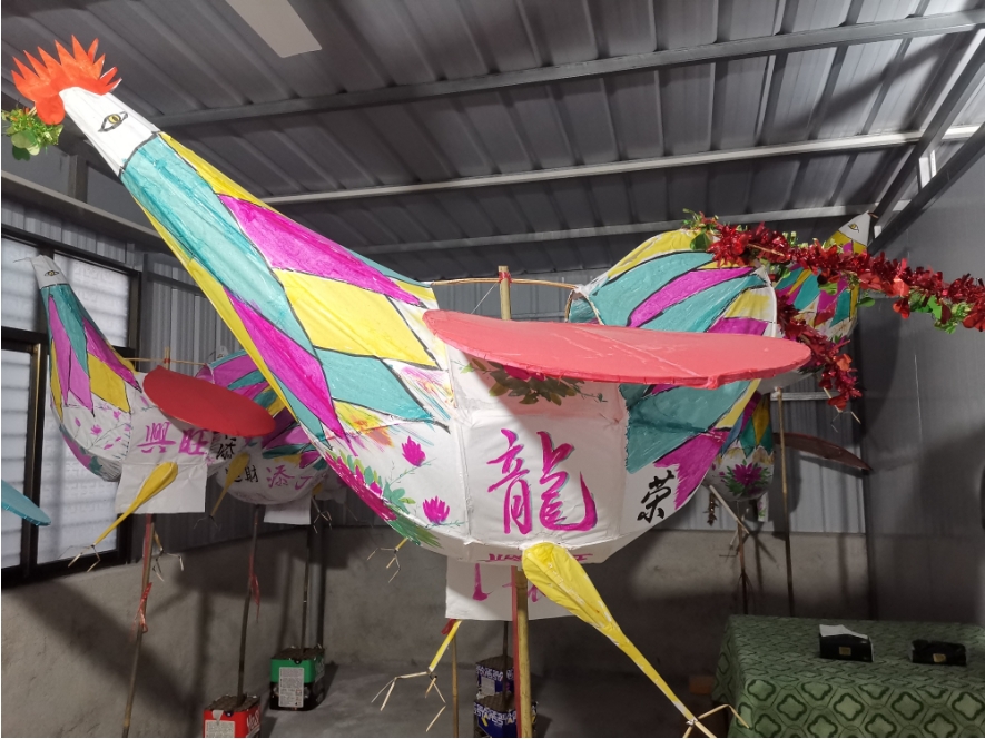 “客家方言中,‘灯’与‘丁’同音,鸡公灯也寓意着财丁兴旺。”周芙明用粗细不一的竹子编出公鸡外形,在竹架上糊上白纸,之后再上色,一个鸡公灯便制作完成了。