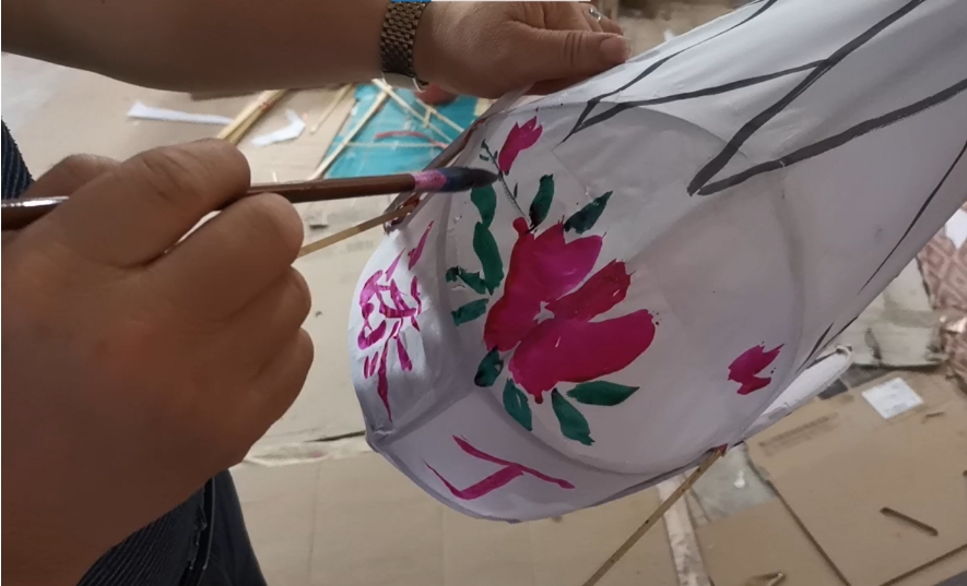 周芙明常用红、绿、蓝、黄几种颜色。这样画出来的灯笼五彩斑斓,很是醒目。上好色、晾晒好的灯笼仍然少头缺尾,此时再用彩带缠至“鸡尾”,糊上用纸做成的“鸡冠”,这才算是大功告成。
