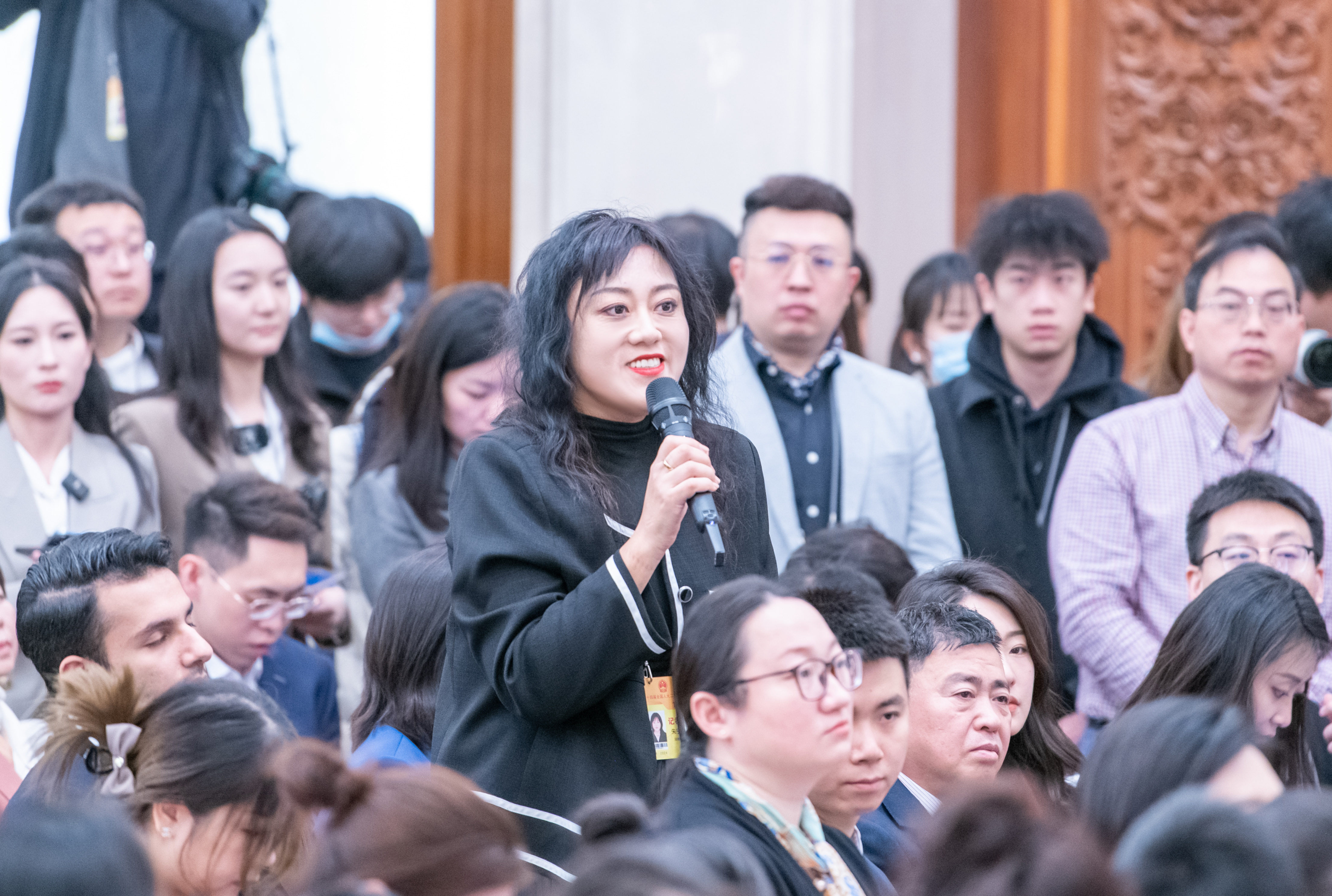 3月4日,十四届全国人大二次会议在北京人民大会堂举行新闻发布会,大会发言人娄勤俭就大会议程和人大工作相关问题回答中外记者的提问。图为本报记者提问。 本报记者 王建军 摄