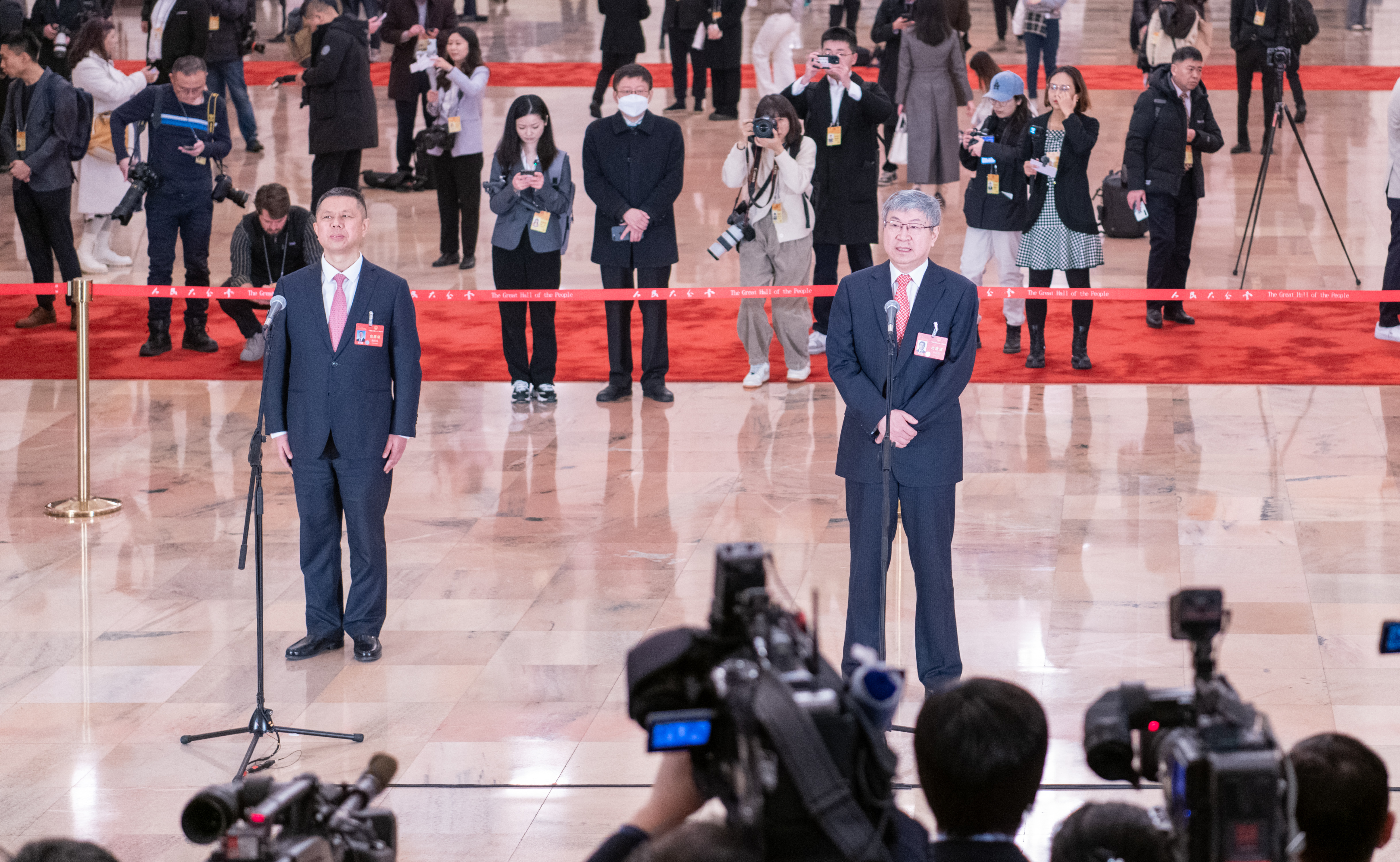 3月5日,十四届全国人大二次会议首场“代表通道”采访活动在北京人民大会堂举行。图为奇瑞控股集团董事长尹同跃代表(右)、天合光能股份有限公司董事长高纪凡代表接受记者采访。 本报记者 王建军 摄