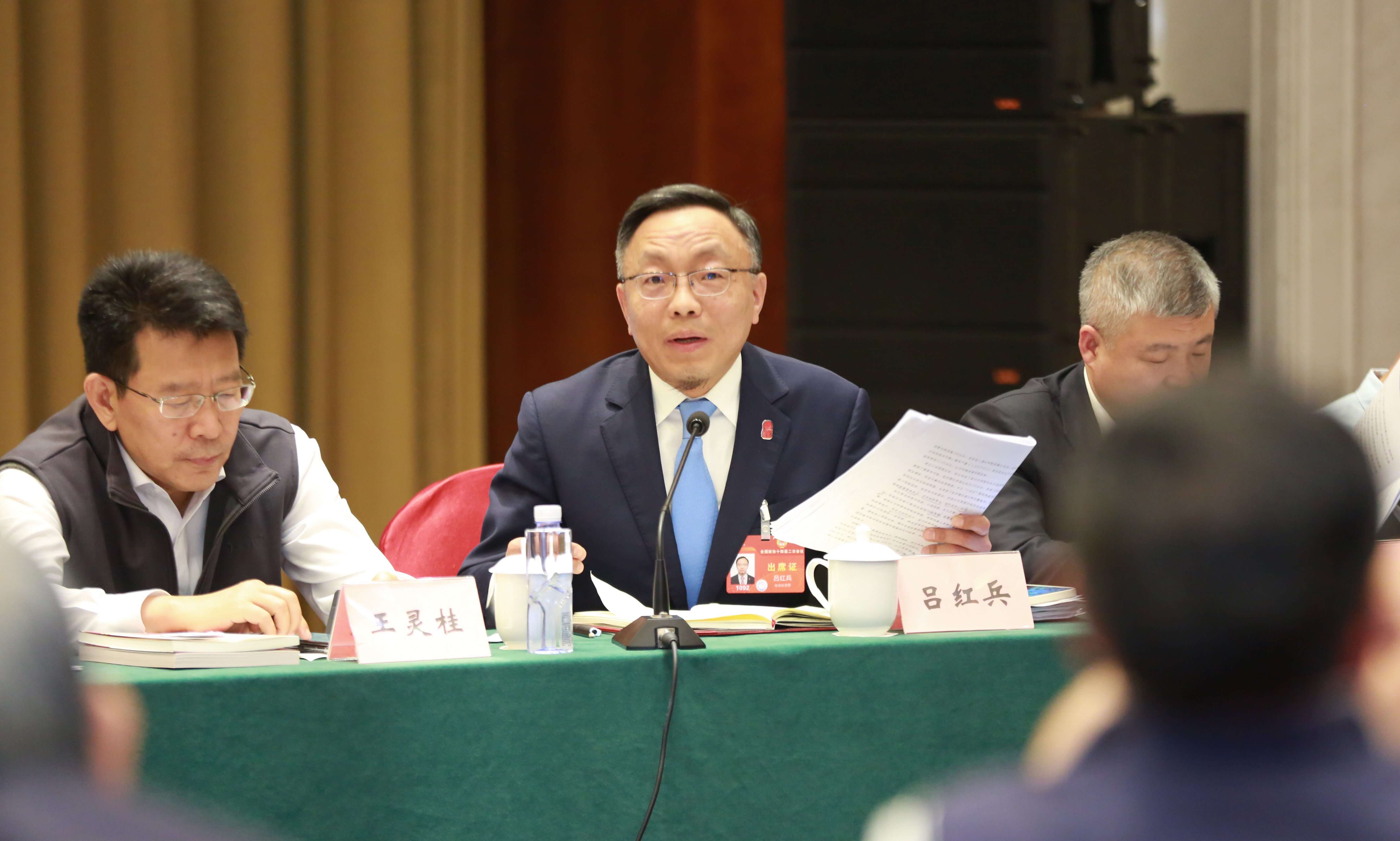 3月6日,参加全国政协十四届二次会议界别联组会议的中华全国律师协会监事长吕红兵委员(中)与参会委员交流。 本报记者 徐伟伦 摄