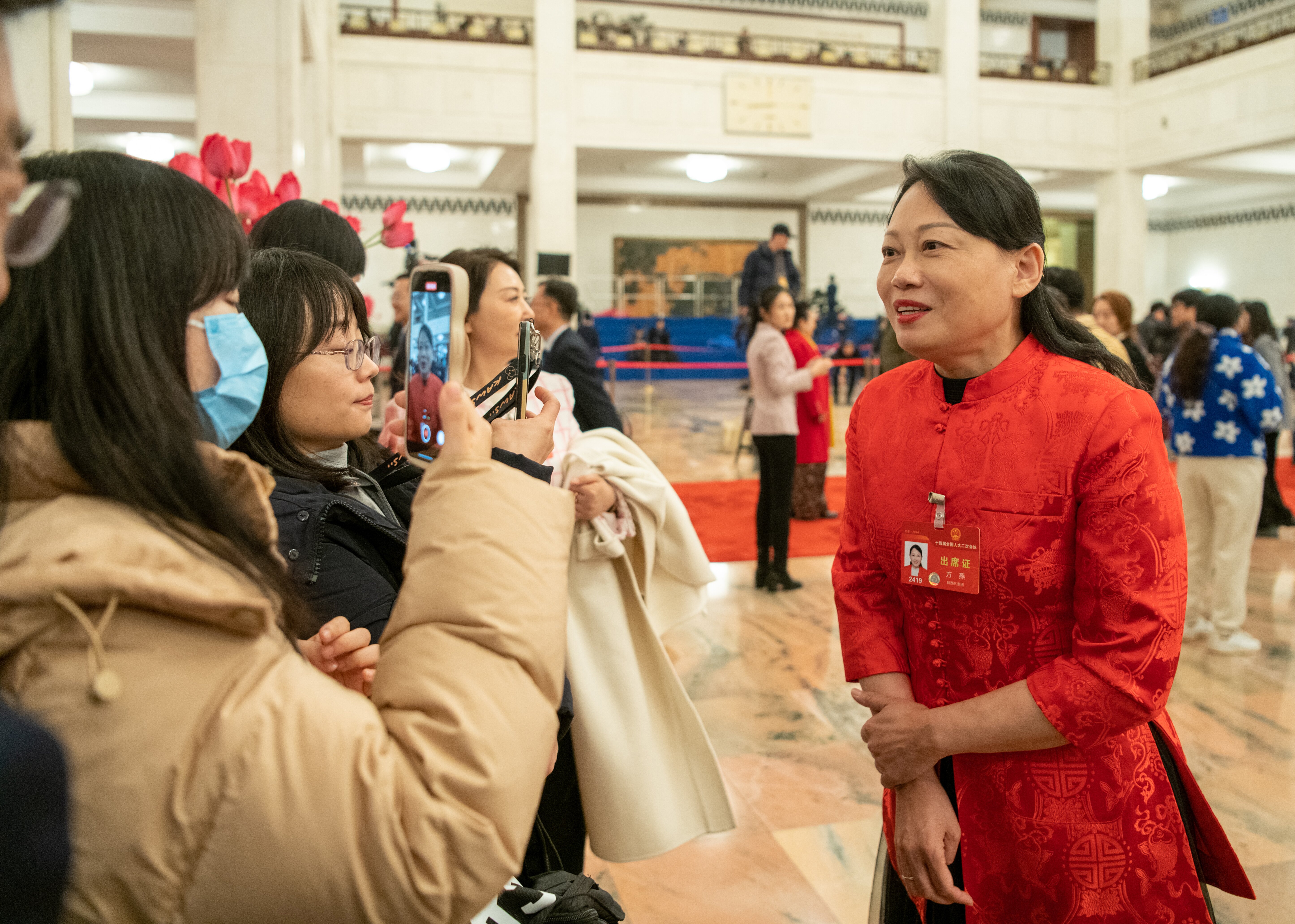 3月5日,全国人大代表、陕西省律师协会监事长方燕(右一)接受记者采访。 本报记者 王建军 摄