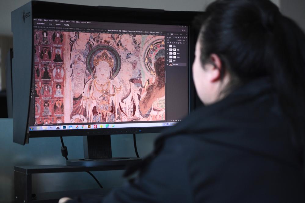 敦煌研究院文物数字化保护团队成员在拼接壁画图像(2023年4月25日摄)。新华社记者 陈斌 摄