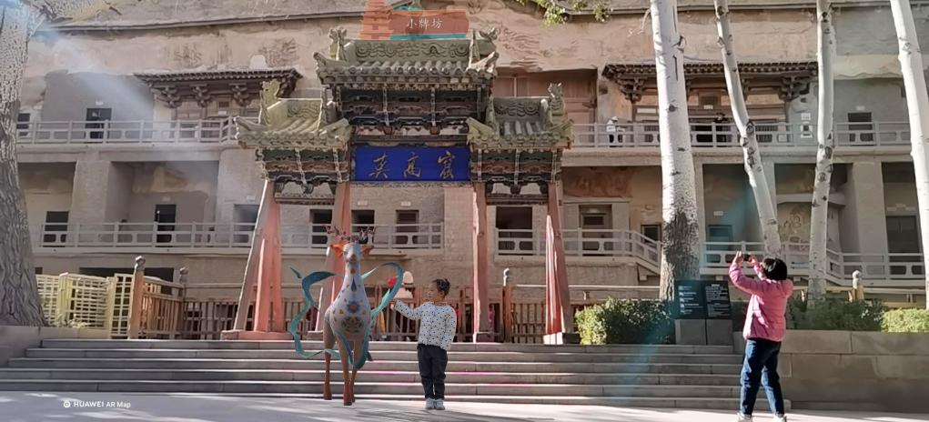 置身莫高窟,拿出手机,身披丝带的九色鹿竟从壁画中“飞身而下”。摸摸它,乖巧的小鹿还会轻扭身体,与人互动。人、实体洞窟和虚拟画面三者同时出现在镜头里,常令游客倍感新奇。