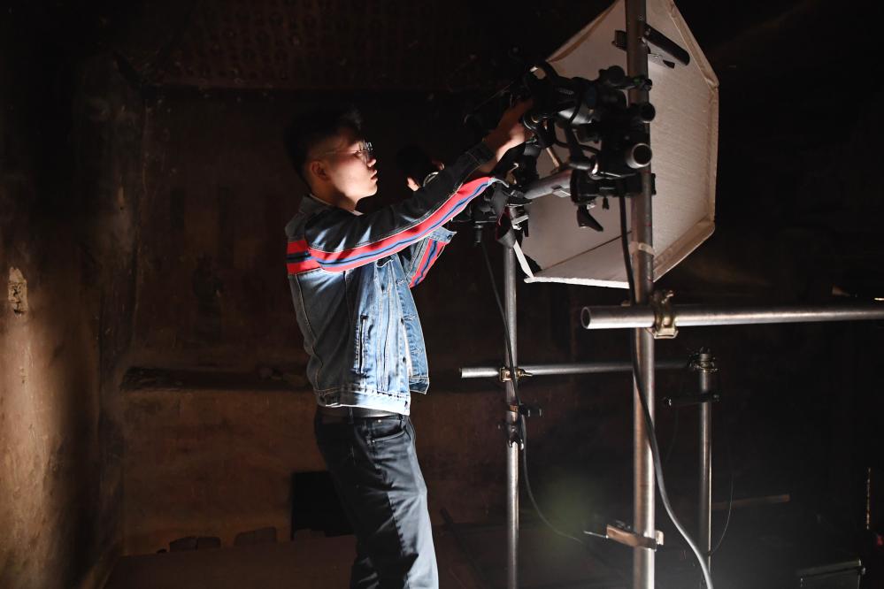 敦煌研究院文物数字化保护团队成员在洞窟内调试设备,准备进行壁画图像采集(2023年4月25日摄)。新华社记者 陈斌 摄