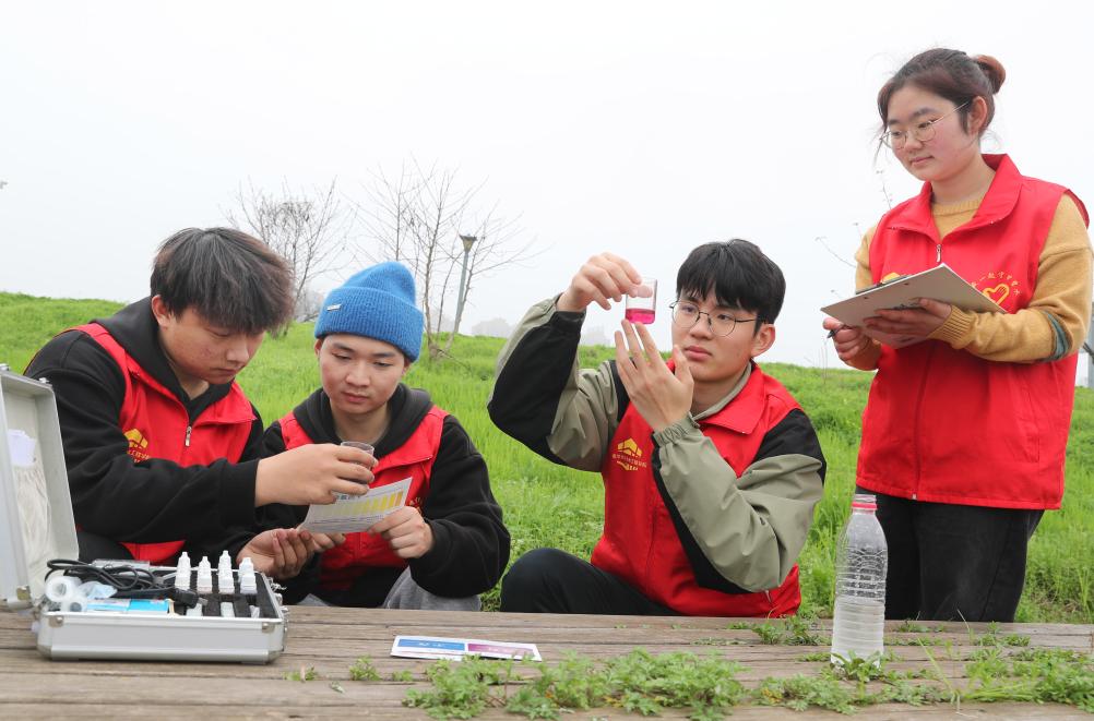 2024年3月17日,湖南省衡阳市雁峰区东洲岛上,南华大学土木工程学院志愿者们在检测湘江水质。新华社发(曹正平摄)