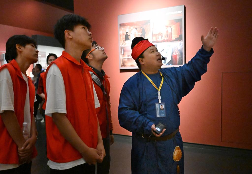 2024年4月26日,河南博物院志愿者刘焱(右一)为高校志愿者讲解。新华社记者 李嘉南 摄