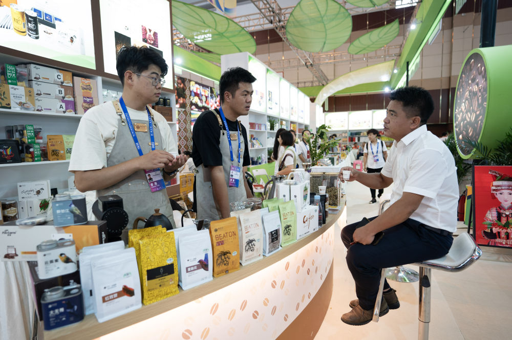 来自云南保山的参展商在第七届中国—南亚博览会上向参观者介绍咖啡产品(2023年8月16日摄)。新华社记者 陈欣波 摄