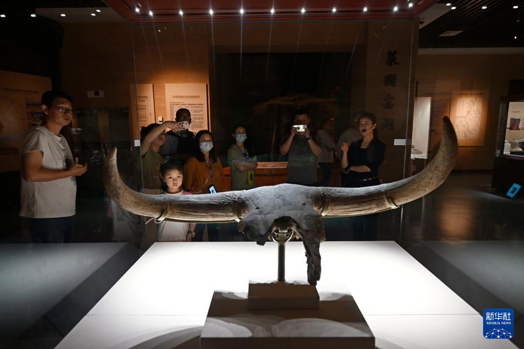 游客在宁夏博物馆欣赏展出的牛头化石(5月14日摄)。