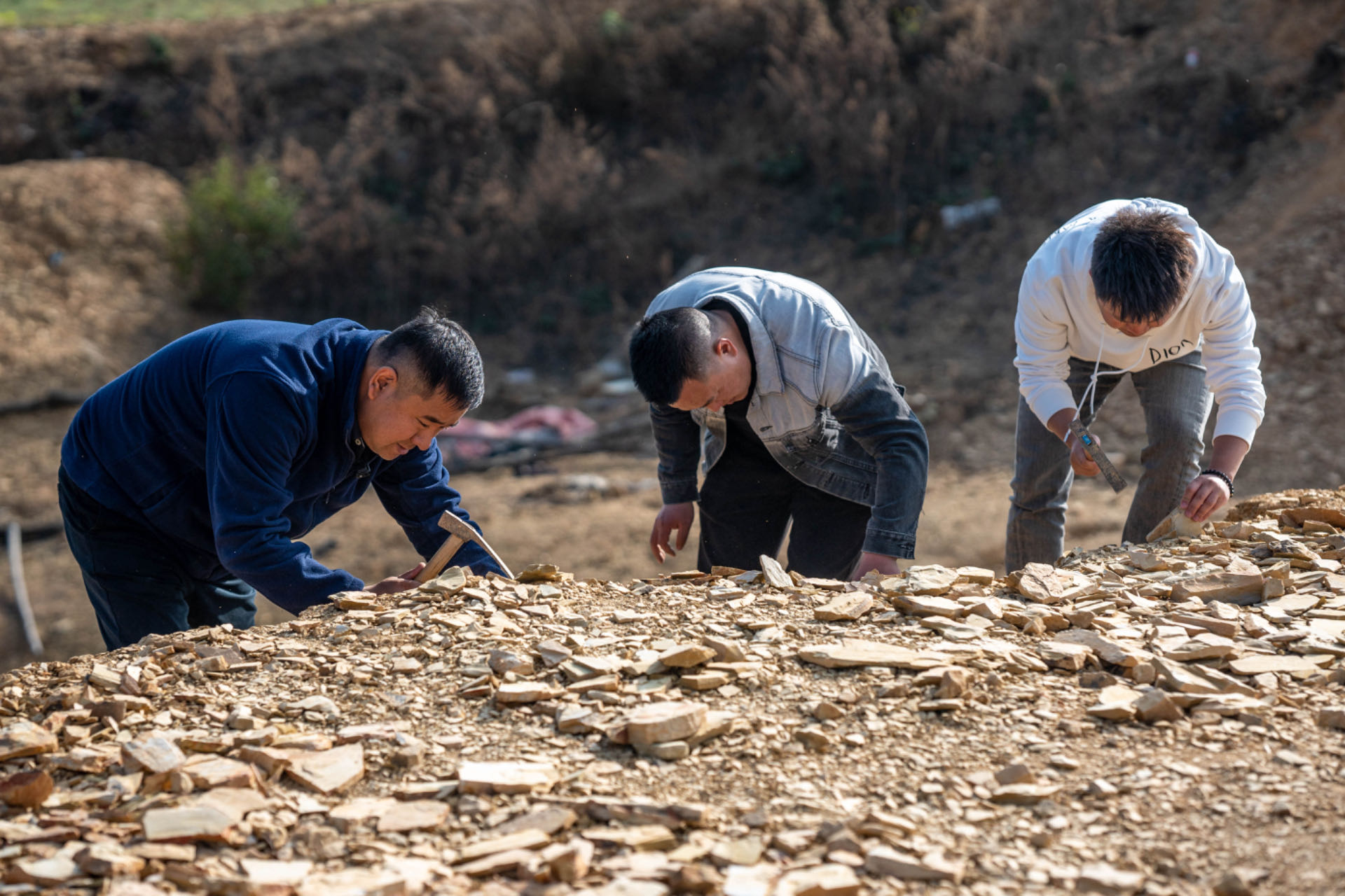 全国人大代表郭进(左一)在野外进行化石零星采集。