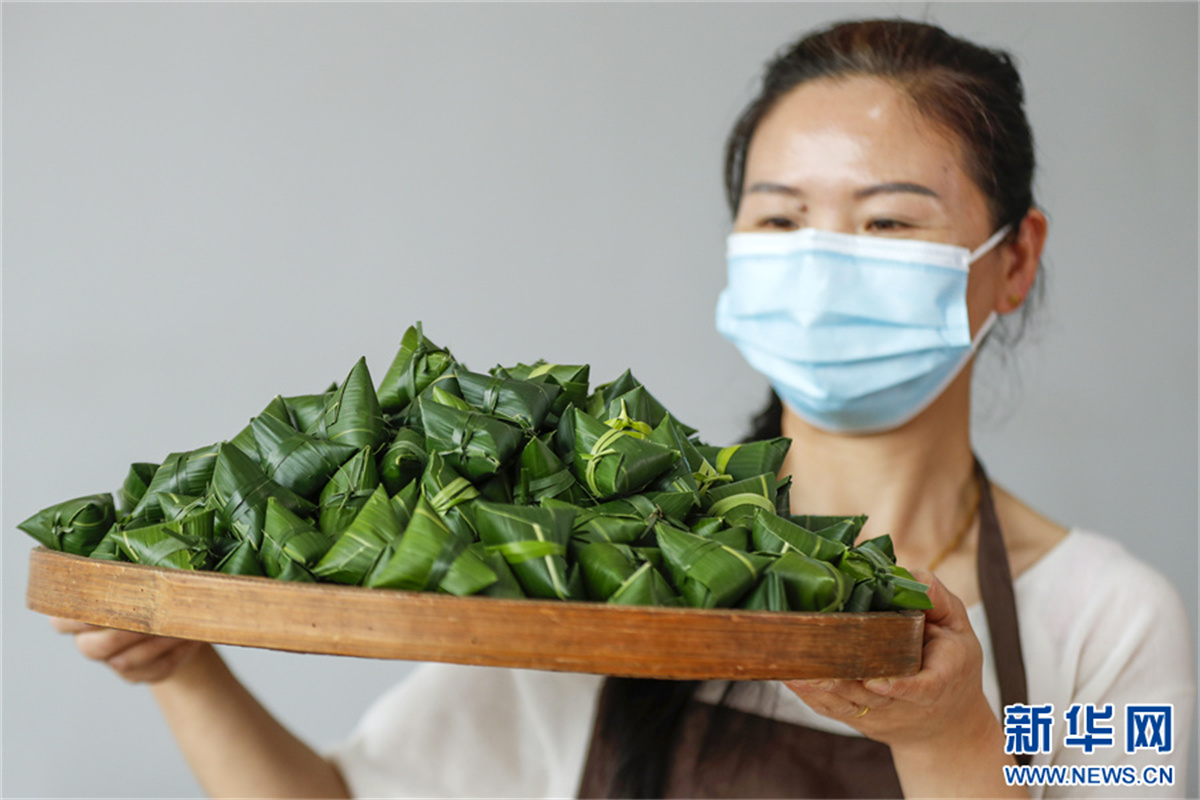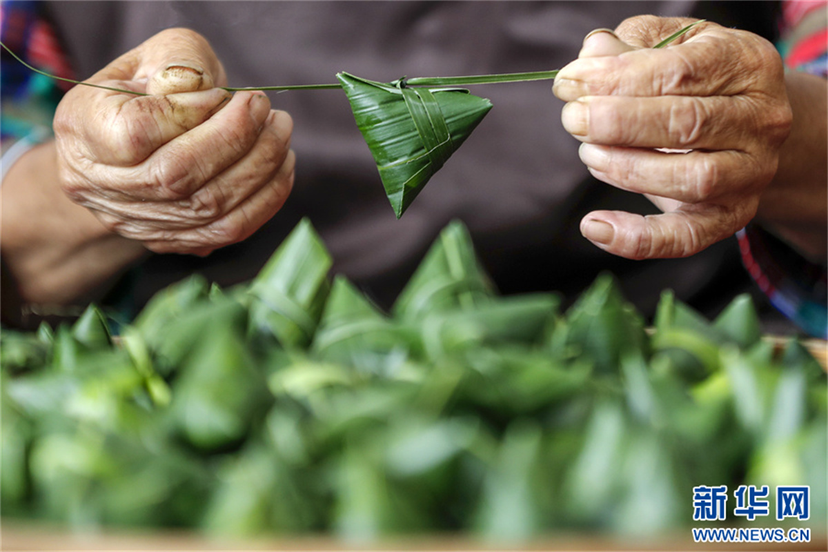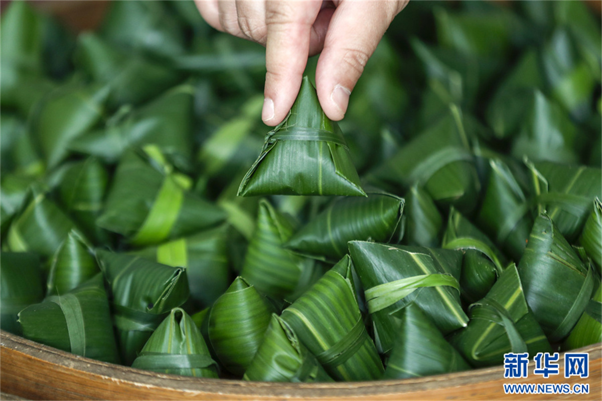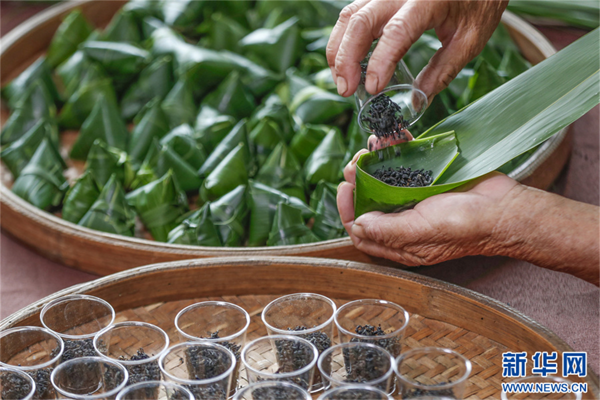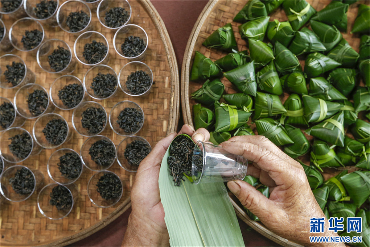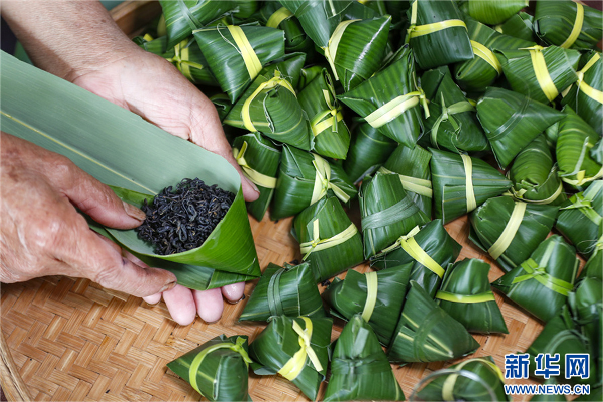 端午临近,在安徽省黄山市祁门县古溪乡际源村,茶工以祁门红茶为“馅料”,用传统包粽子的方法,纯手工制作“粽茶”。“粽茶”小巧玲珑,浸泡出来的茶汤,既有箬叶香,又有红茶香,好看又好喝的“粽茶”,深受消费者的喜爱。新华网发(施亚磊 摄)