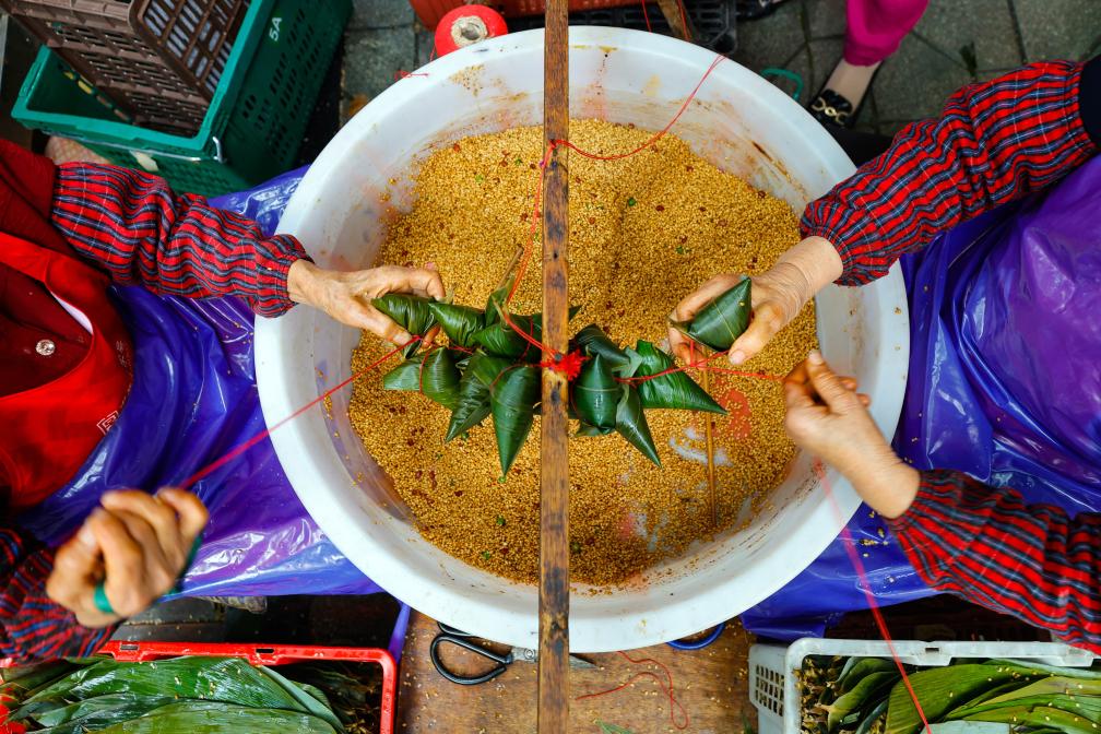 6月7日,在四川省成都市的“粽子一条街”上,一家粽子店的工作人员在包粽子。新华社记者 沈伯韩 摄