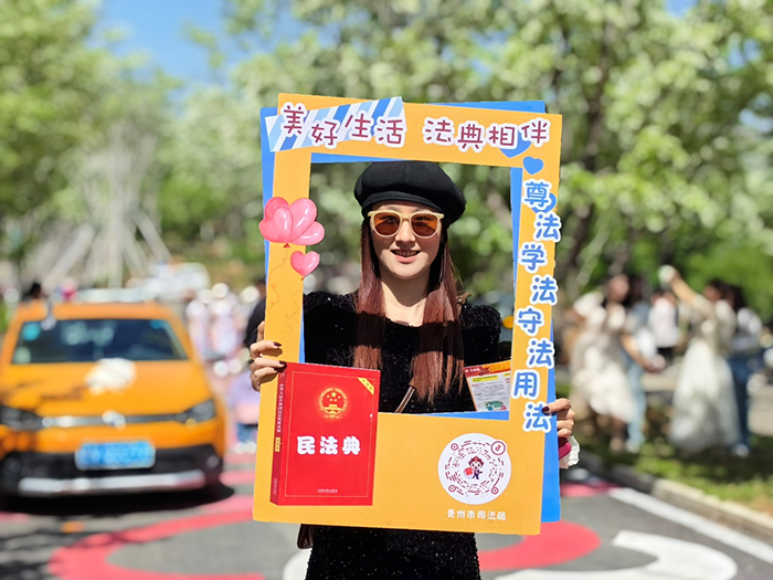 图为在“流苏节”活动现场,游客借助普法道具“合影框”,打卡留念