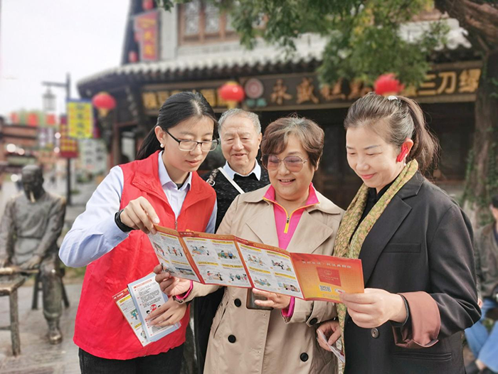 图为普法志愿者在青州古城,向游客宣传《中华人民共和国民法典》