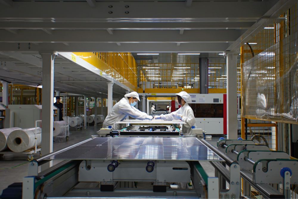 在安徽省滁州市凤阳县一家光伏企业内,工人在生产线上忙碌(2023年6月14日摄)。新华社发