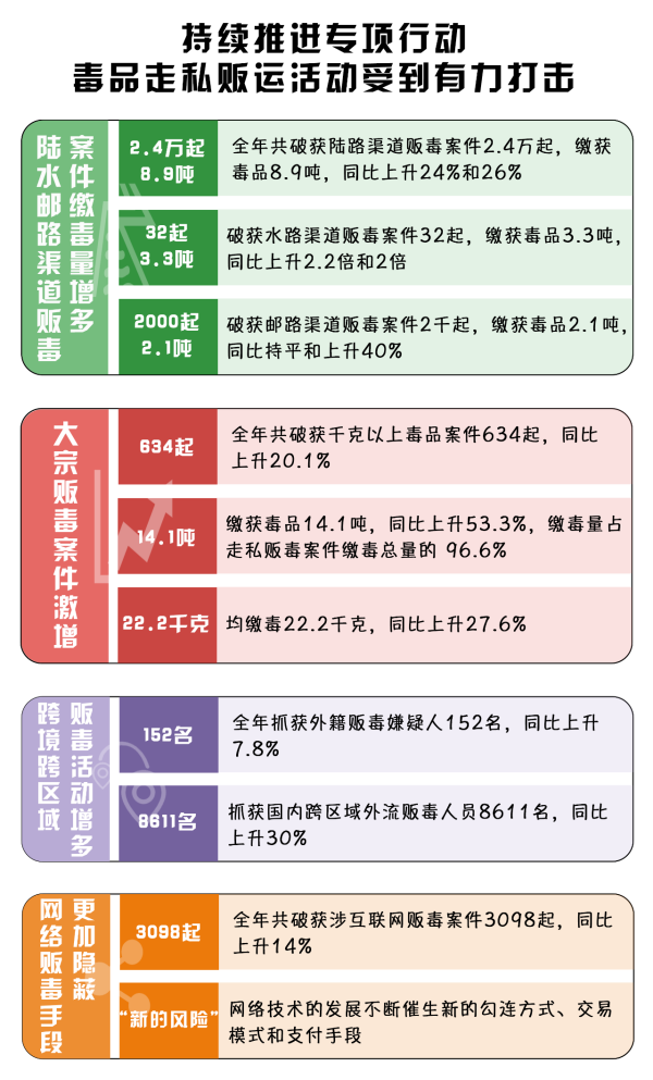 通过持续推进“清源断流”“净边”“猎枭”等专项行动,毒品走私贩运活动受到有力打击。全年共破获走私贩运毒品案件3.2万起,抓获犯罪嫌疑人5.6万名,缴获毒品14.6吨,同比分别上升18.5%、36.5%和43.1%。