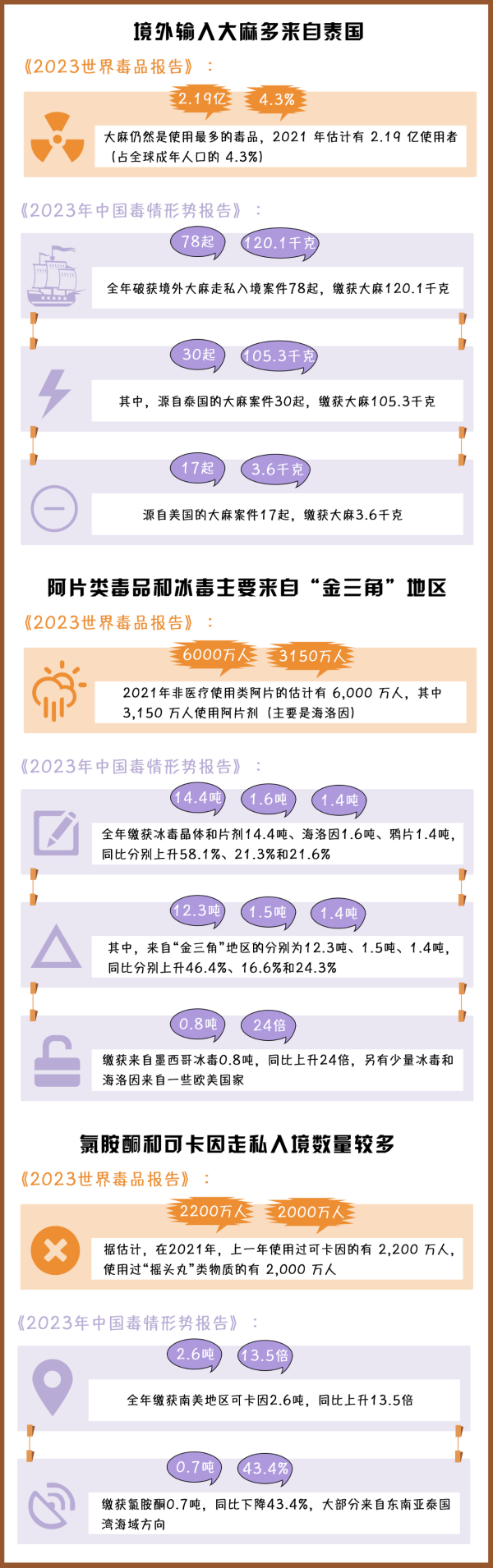 (制作:法治网舆情中心 数据来源:《2023年世界毒品报告》《2023年中国毒情形势报告》)