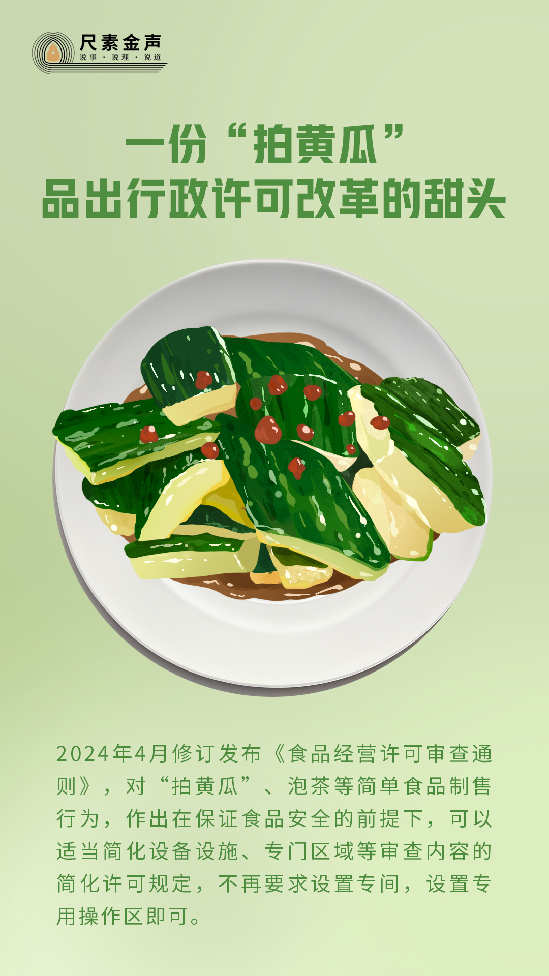 结合餐饮业实际,考虑中小经营主体和消费者的诉求,科学评估食品安全风险,去年6月,市场监管总局修订发布《食品经营许可和备案管理办法》,今年4月修订发布《食品经营许可审查通则》,对“拍黄瓜”、泡茶等简单食品制售行为,作出在保证食品安全的前提下,可以适当简化设备设施、专门区域等审查内容的简化许可规定,不再要求设置专间,设置专用操作区即可。各地市场监管部门立足当地实际优化“拍黄瓜”经营许可条件,相继出台相关食品经营许可和备案管理实施细则。比如,修订的《上海市食品经营许可和备案管理实施办法》已于5月10日正式实施,明确加工制作植物性冷食类食品(不含非发酵豆制品),可申请简单制售经营项目,在保证食品安全的前提下,可仅设置专区。