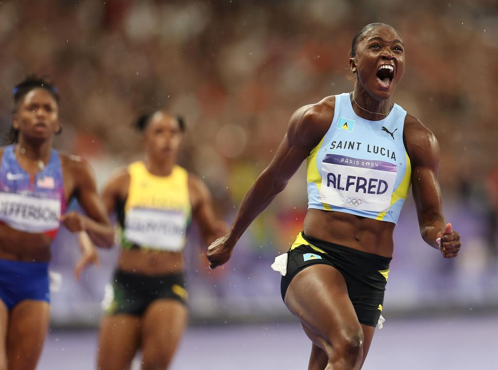 8月3日,圣卢西亚选手阿尔弗雷德在赛后庆祝。当日,巴黎奥运会田径女子100米决赛在法兰西体育场举行。圣卢西亚选手阿尔弗雷德获得冠军。新华社记者 李颖 摄