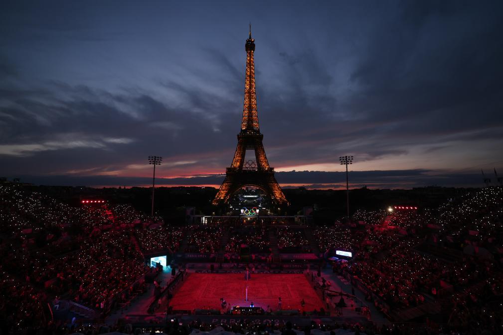 7月27日,巴黎奥运会沙滩排球比赛在埃菲尔铁塔体育场举行。雨后的巴黎,晚霞与铁塔、赛场交相辉映。新华社记者 黄宗治 摄