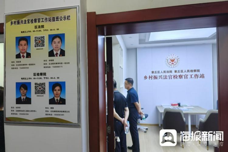 叶贵芬带领采访团参观了村里的乡村振兴法官检察官工作站,按照工作站值班公示,法官、检察官各有两名,分时段在村中驻站工作,为村民提供法律帮助。