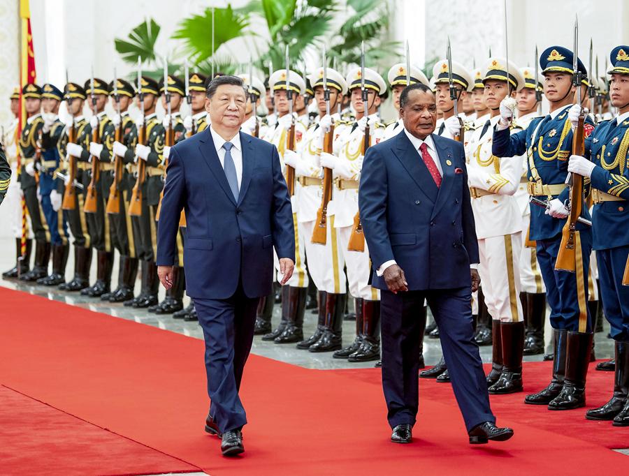 9月6日上午,国家主席习近平在北京人民大会堂同来华出席中非合作论坛北京峰会并进行国事访问的刚果(布)总统萨苏举行会谈。这是会谈前,习近平在人民大会堂北大厅为萨苏举行欢迎仪式。
