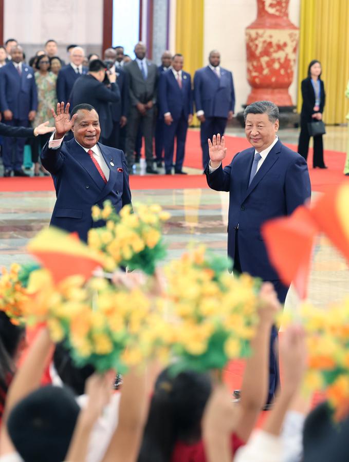 9月6日上午,国家主席习近平在北京人民大会堂同来华出席中非合作论坛北京峰会并进行国事访问的刚果(布)总统萨苏举行会谈。这是会谈前,习近平在人民大会堂北大厅为萨苏举行欢迎仪式。