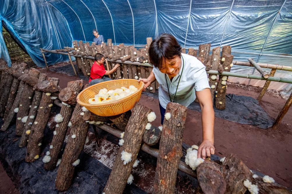 7月4日,巴中市通江县陈河镇河坝场村村民贾玉琼一家在采摘自家种植的银耳。新华社发(受访单位供图)