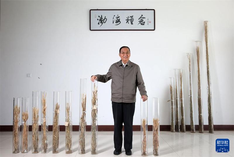 李振声院士在中国科学院遗传与发育生物学研究所农业资源研究中心南皮生态农业试验站展示历次杂交后获得的小麦品种的标本(2014年5月5日摄)。 新华社记者金立旺摄