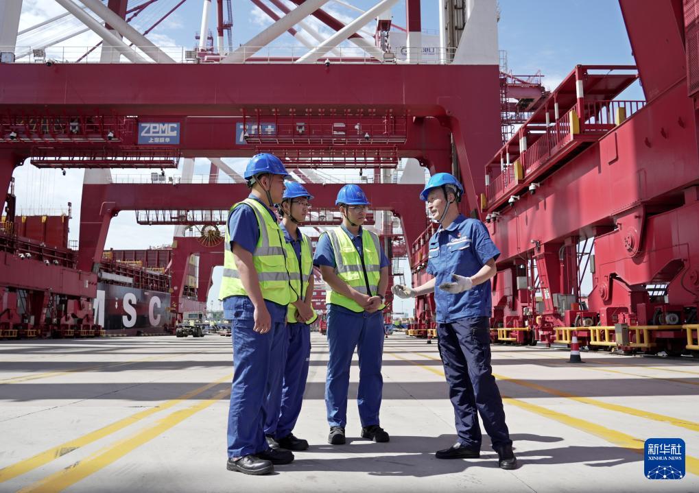 许振超(左二)和团队成员在码头研究传统集装箱桥吊的智能化升级方案(9月2日摄)。新华社发(闫军摄)