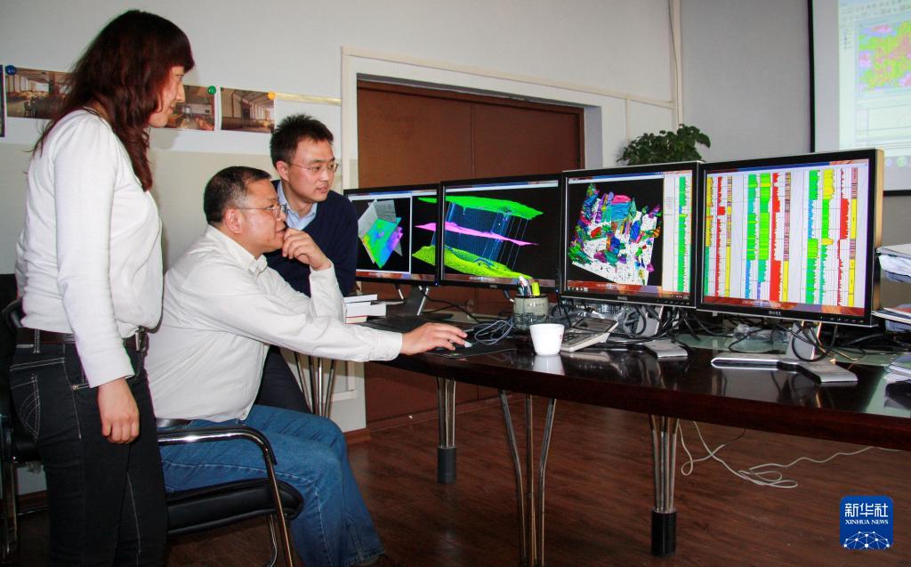 黄大年(左二)带领科研团队成员研究问题(2010年11月22日摄)。 新华社发