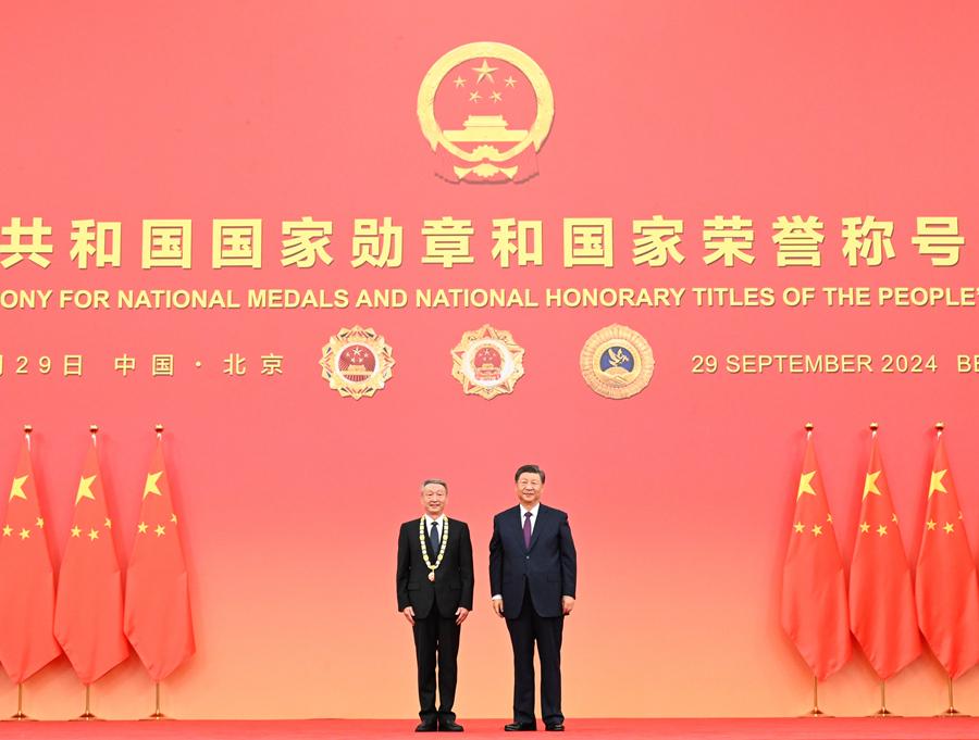 9月29日,中华人民共和国国家勋章和国家荣誉称号颁授仪式在北京人民大会堂金色大厅隆重举行。中共中央总书记、国家主席、中央军委主席习近平向“人民工匠”国家荣誉称号获得者许振超颁授奖章。