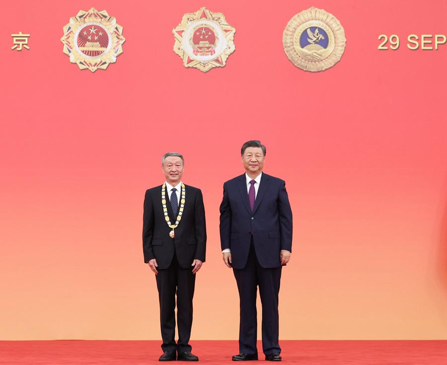9月29日,中华人民共和国国家勋章和国家荣誉称号颁授仪式在北京人民大会堂金色大厅隆重举行。中共中央总书记、国家主席、中央军委主席习近平向“人民工匠”国家荣誉称号获得者许振超颁授奖章。