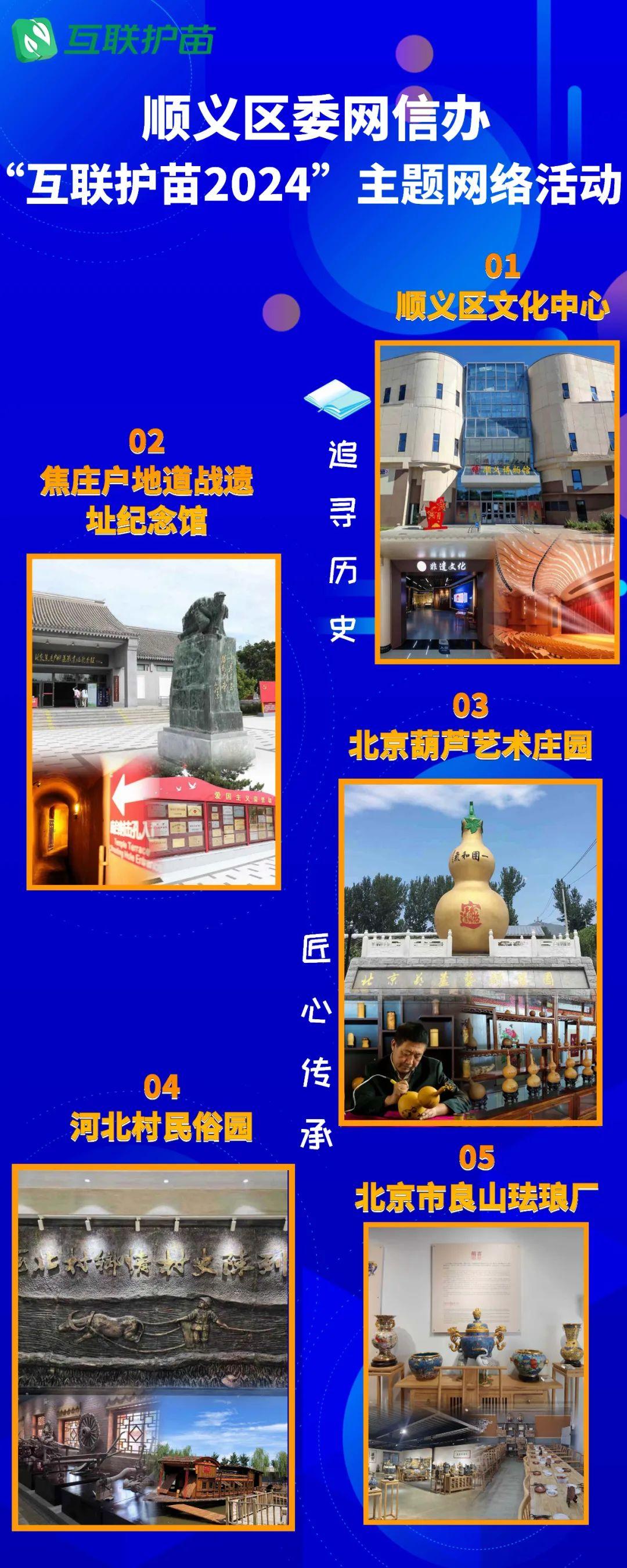 联合区文旅局推出“追寻历史,匠心传承”研学路线(纳入市级6条推广线路之一),设置顺义区文化中心、焦庄户地道战遗址纪念馆、北京葫芦艺术庄园、河北村民俗园、北京市良山珐琅厂,共五个点位,学生可通过现场打卡、游历体验等开展非遗、爱国主义教育等社会实践活动,并已通过高德、百度、美团进行线上发布。