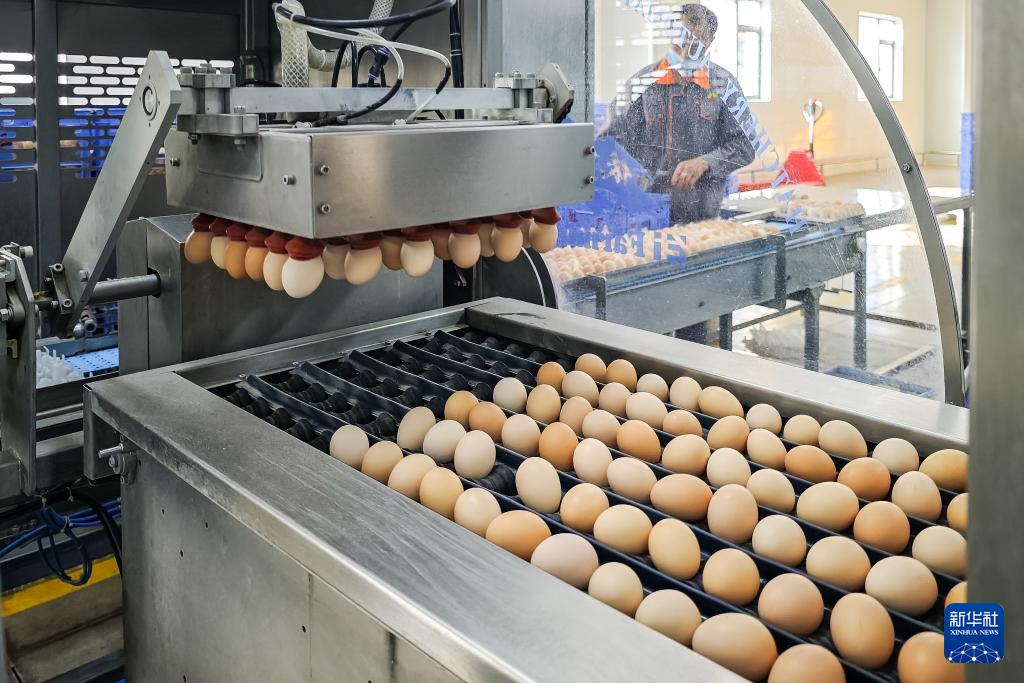 11月29日,石门县一家家禽加工企业码蛋车间的真空吸蛋器在作业。