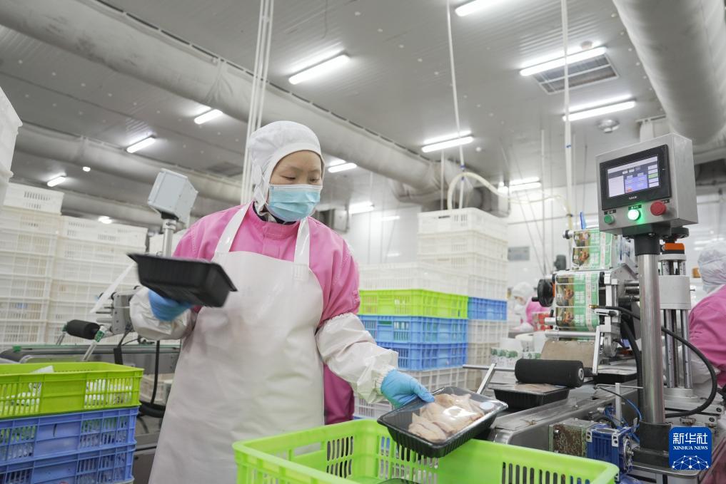 11月29日,在石门县一家家禽加工企业冷链车间,工人在包装鸡肉。