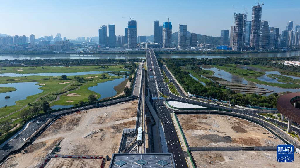 12月2日,澳门轻轨从莲花站开往横琴站(无人机照片)。新华社发(张金加摄)