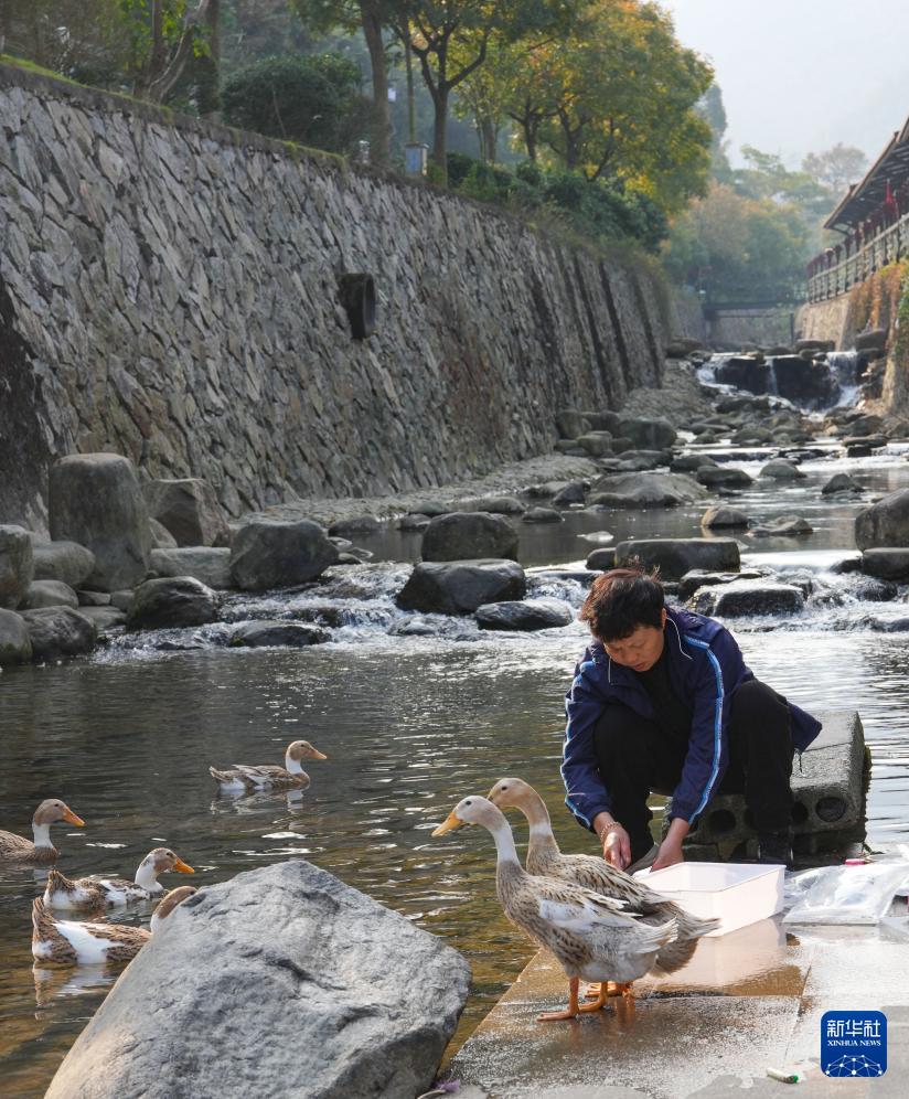 12月3日,在浙江省舟山市定海区新建村,村民在小溪边清洗物品。