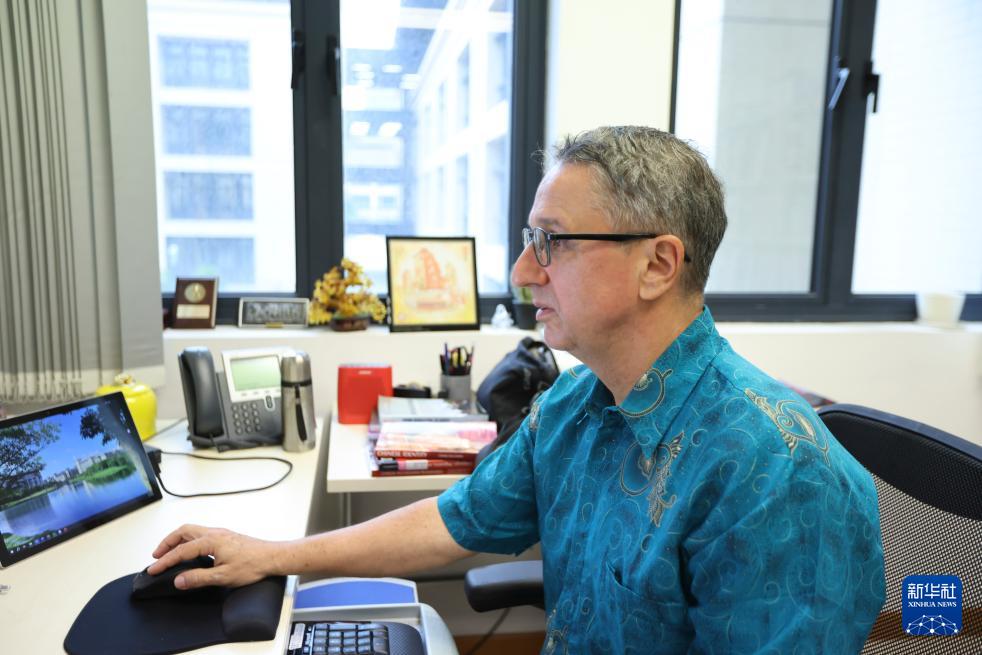 2024年11月21日,澳门城市大学葡语国家研究院的助理教授、来自葡萄牙的若昂·西蒙斯(中文名朱奥)在办工室工作。新华社记者 王露 摄
