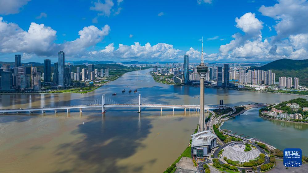 这是7月8日拍摄的澳门半岛、横琴及珠海景色(无人机照片)。新华社发(张金加 摄)