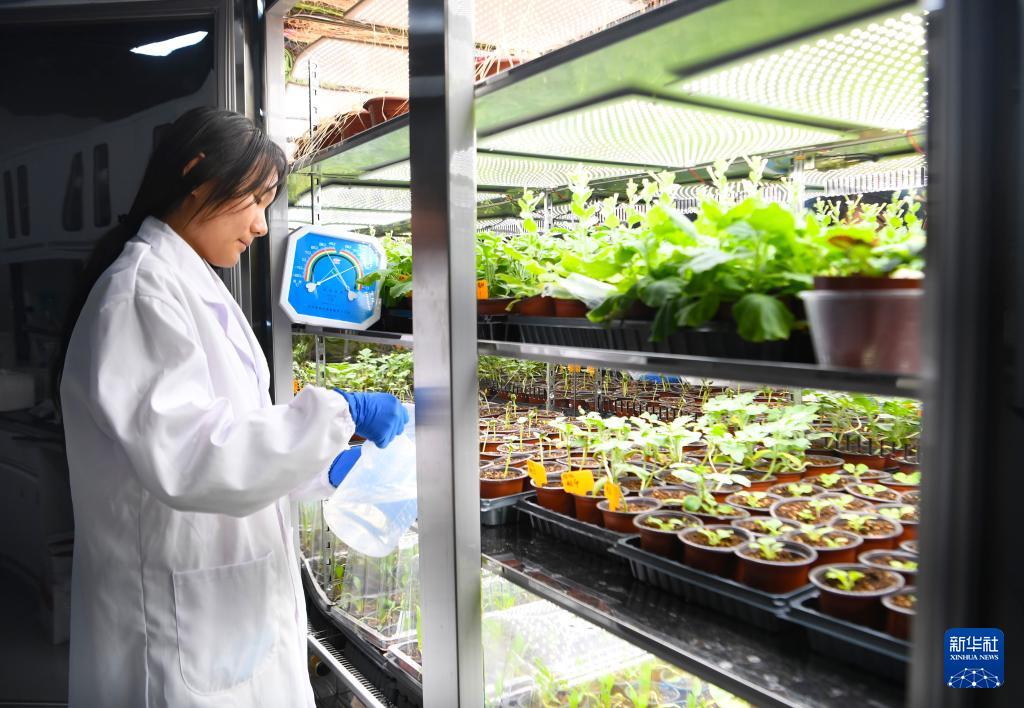 12月25日,在位于河南新乡的中原农谷实验室,中国农科院中原研究中心科研人员给植物光照培养箱内的样本浇水。
