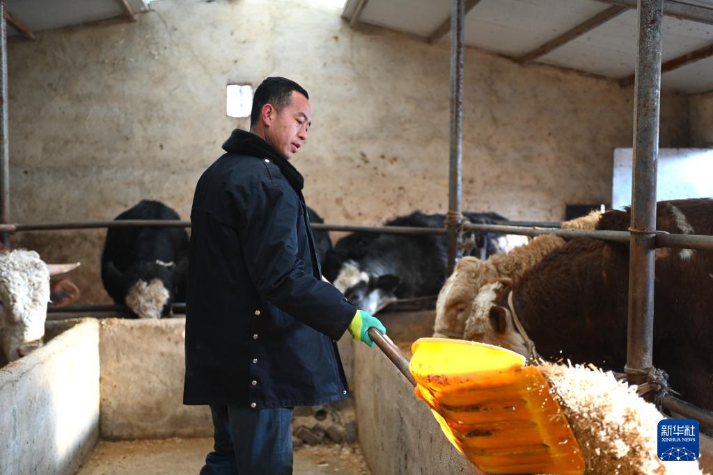 1月7日,农户在宁夏固原市泾源县自家牛棚给牛添加饲料。