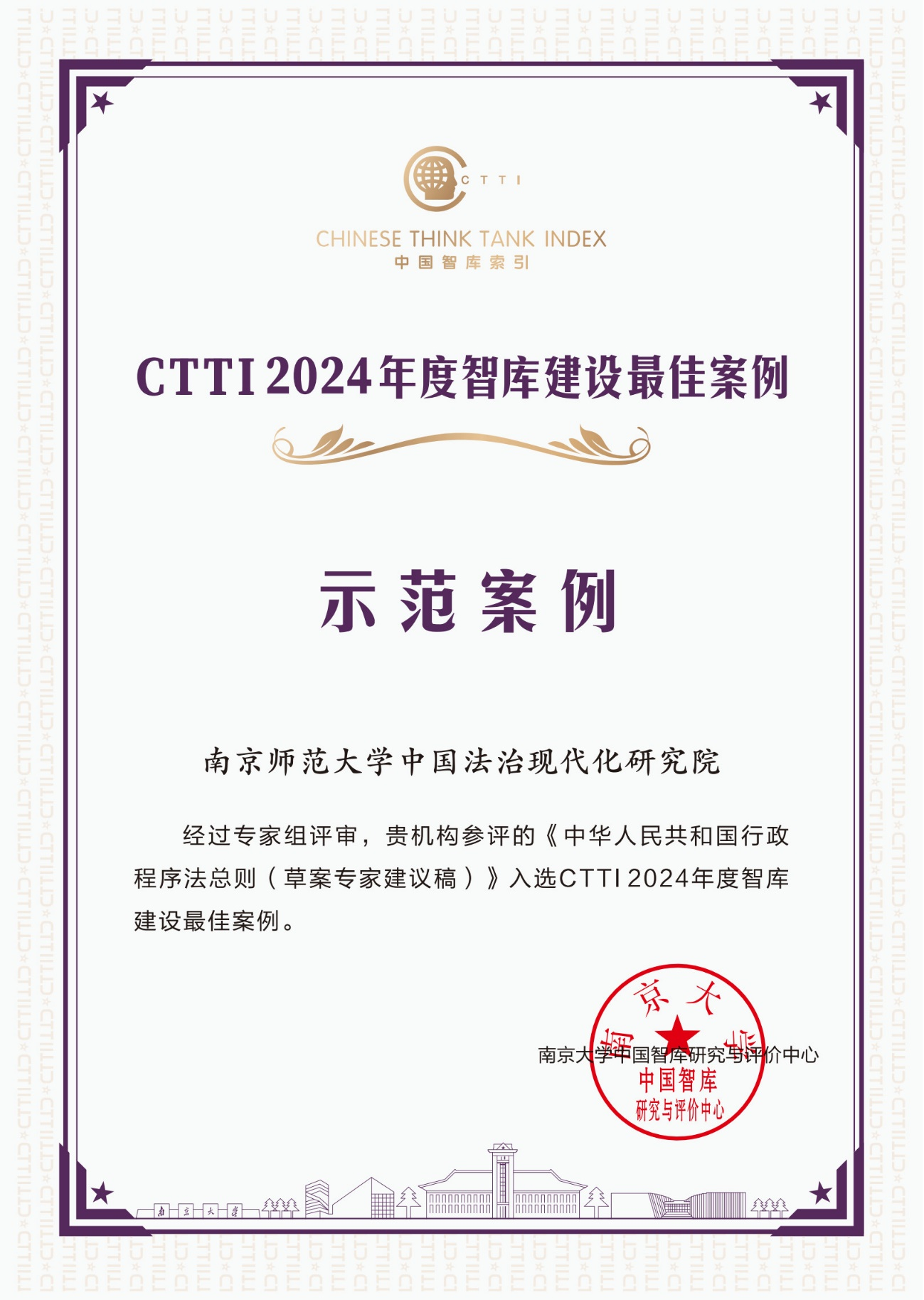 2024年12月7日,南京大学中国智库研究与评价中心公布,南京师范大学中国法治现代化研究院的《中华人民共和国行政程序法总则(草案专家建议稿)》入选CTTI2024年度智库建设最佳案例示范案例。