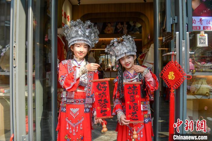 图为小朋友身着民族服饰在福州罗源县溪尾街历史文化街区拍照打卡。刘其燚 摄