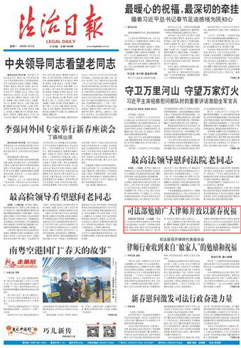 本报北京1月26日讯 记者赵婕 1月26日,司法部召开律师代表座谈会,听取对律师工作的意见建议,向全国广大律师致以新春祝福,勉励大家深入践行习近平法治思想,做党和人民满意的好律师。党组书记、部长贺荣,党组成员、副部长王振江出席会议。