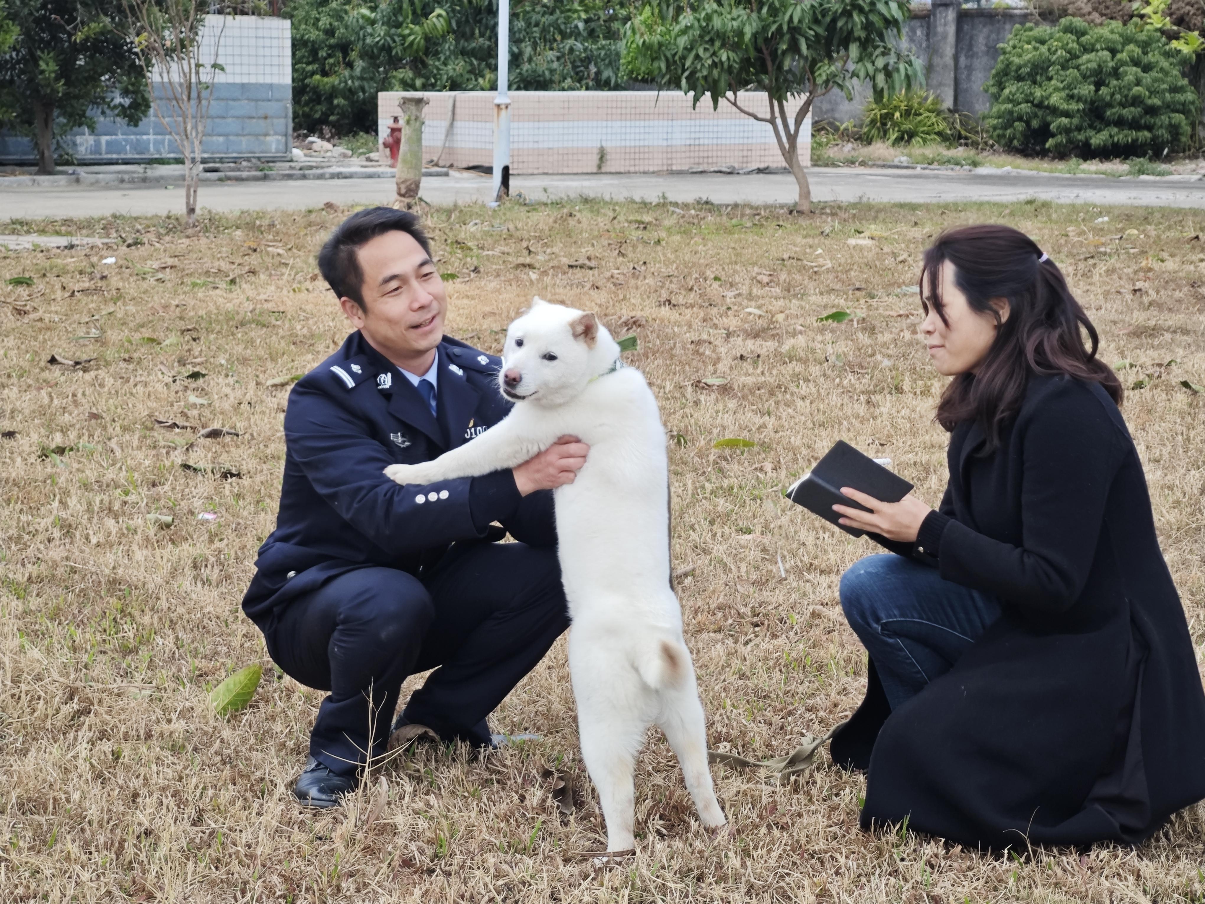 说话间,两名训导员带着他们的山地警犬从犬舍中走了出来,其中一身白毛的名叫小龙女,训导员刚一松手,它就直奔记者而来,后腿直立着把两只前爪搭在记者的左腿上,在众人的笑声中,迅即跑开,扑向另一人。和小龙女的活泼不同,另一只小布丁则显得很文静,在记者试图给它拍照时,它迅速躲到了训导员罗飞亮的身后。罗飞亮蹲下身,轻轻地拍它的背,抚摸它的头,安慰着它。