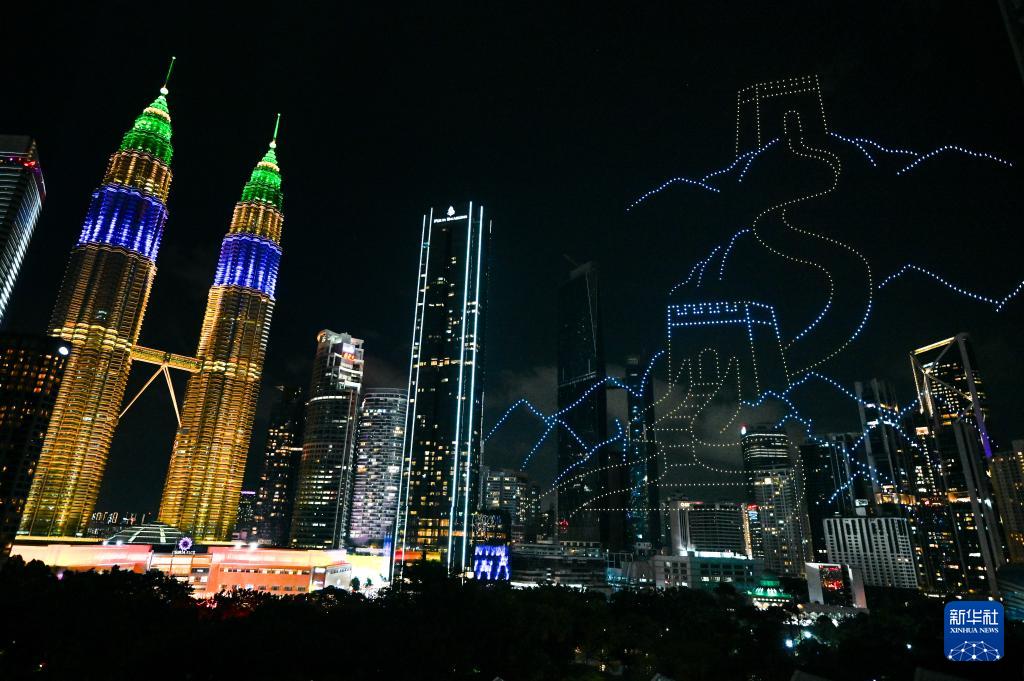 1月25日,在马来西亚吉隆坡举行的2025年“欢乐春节”全球启动仪式前,无人机展示“中马友谊万岁”字样。