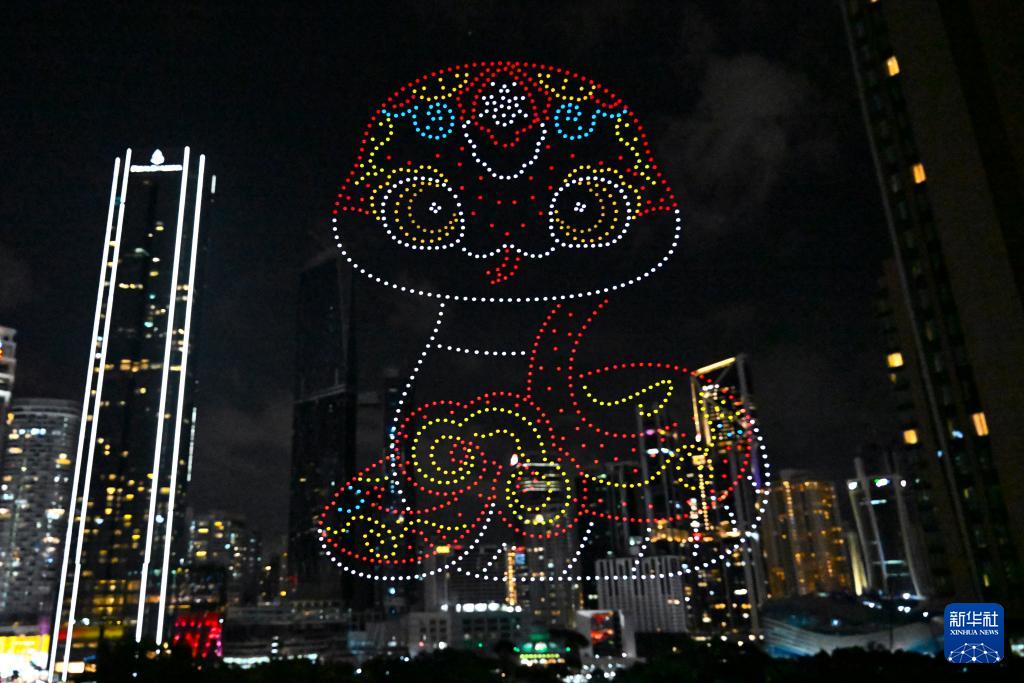 1月25日,在马来西亚吉隆坡举行的2025年“欢乐春节”全球启动仪式前,无人机展示蛇年主题图案。